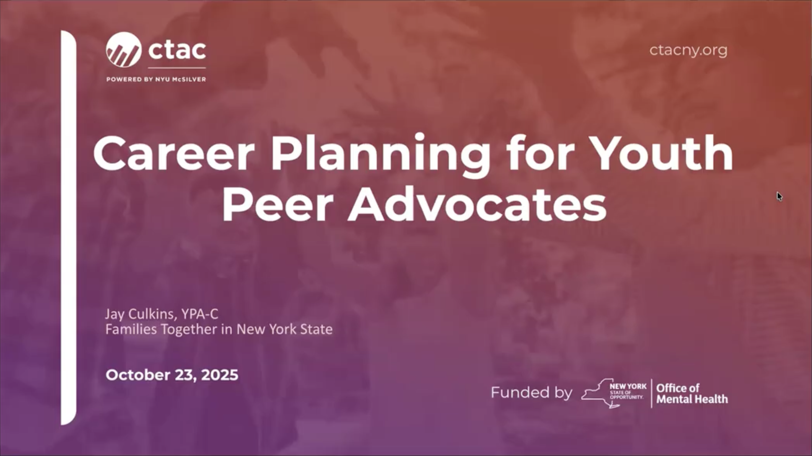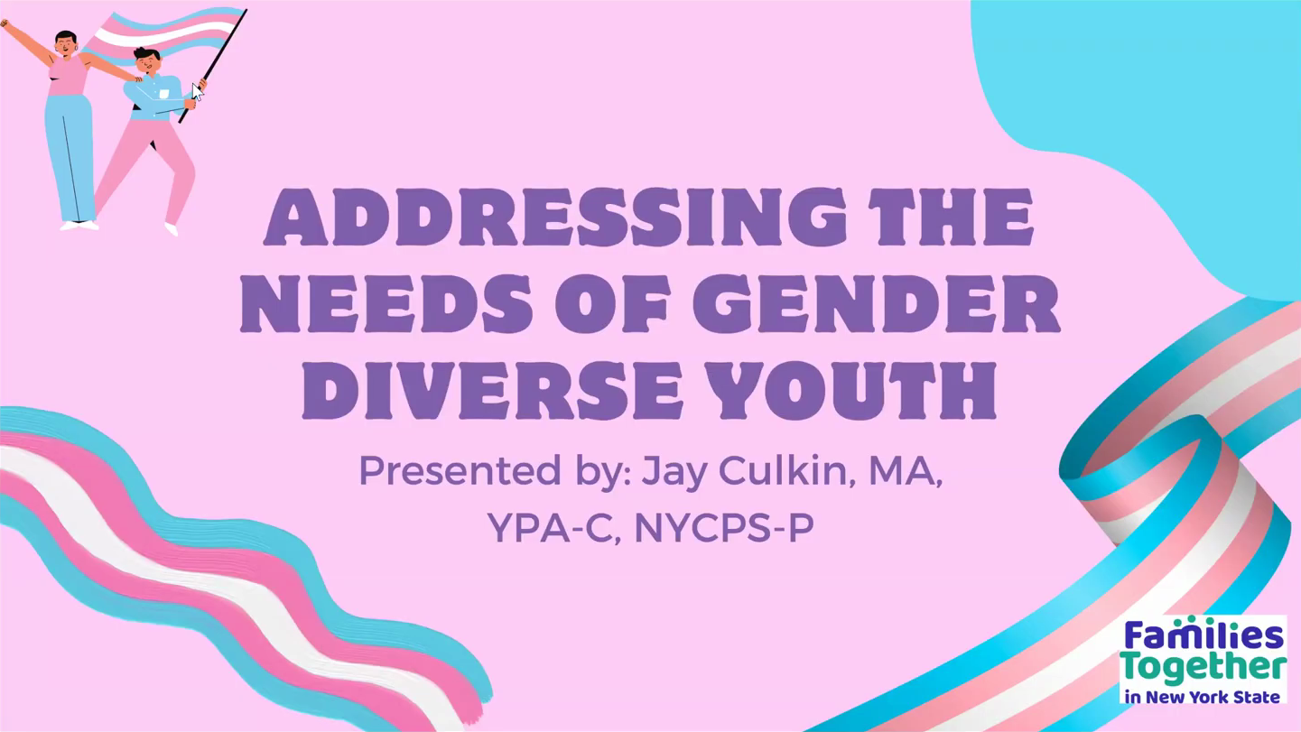 Gender diverse youth are faced with so many unique challenges. The media has been covering a lot of controversies and politically charged conversations around transgender youth. With this, gender diverse youth have become vulnerable to a lot of scrutiny from their communities. As lived experience professionals we may feel unequipped to handle youth who come from a very different background than our own. In this TA call you will learn the basics of gender diversity. You will also learn how to continue to provide strong peer support to the gender diverse youth we serve across New York State. Finally, we will discuss local, state-wide, and online resources regarding gender diversity. Gender diverse people and allies to gender diverse people are all welcome to attend.